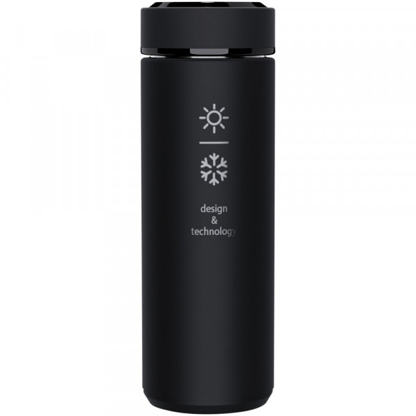 450 ml dubbelwandig geïsoleerde RVS fles met een temperatuursensor. Door het "Touch & Light"-systeem wordt de temperatuur van uw drank weergegeven op de flessendop (in Celsius). Geschikt voor warme en koude dranken. Geleverd in een cilindervormige geschenkverpakking gemaakt van gerecycled papier. Afmetingen: Ø 47 x 225 mm. Inclusief batterij: CR 2450 (3V). Batterij kan niet worden vervangen. Kan de temperatuur tot 20.000 keer weergeven.